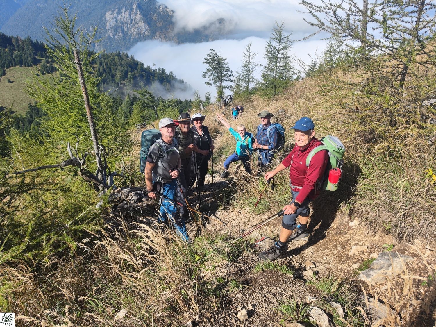 Die Touren gingen auf weniger bekannte Gipfel des Toten Gebirges. Am ersten Tag führte der Tourenleiter seine Begleiter per Seilbahn auf den 986 m hohen Grünberg und dann per pedes vorbei am Baumwipfelpfad mit seinem Aussichtsturm zu dem fast 100 m tiefer liegenden Laudachsee. Von dort führte der Weg hinein in einen teils versicherten Felsensteig, steil bergauf bis zur Hohen Scharte auf 1105 m. Ab hier ging es nun weiter aufwärts, immer entlang der Felsen- Abbruchkante, bis das Katzensteinfenster erreicht war. Nun führte der Felsensteig kurz abwärts, vorbei an der Gamsluckn und dann hinauf auf den Katzenstein mit 1349 m Höhe. Dort bot sich in herrlicher Ausblick zurück zum Laudachsee, auf den Traunsee und auf den benachbarten Traunstein, aber auch auf das Tagesziel des nächsten Tages. Der Rückweg entsprach dem Aufstiegsweg und wurde nur unterbrochen von einer Einkehr in der Ramsaualm knapp über dem Laudachsee. Nach der Rückkehr an der Talstation ging die Fahrt etwa 10 Km zum gebuchten Quartier „URZN“ in Altmünster, hoch über dem Traunsee. Mit schmackhaftem Essen und netten Gesprächen war der Abend schnell vorbei und alle freuten sich schon auf Tag zwei.