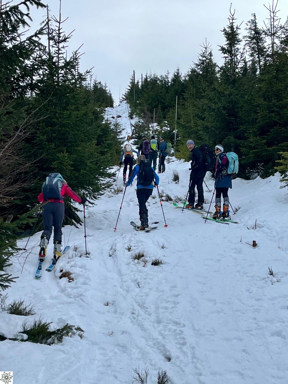 Treffpunkt für 11 Skitouren-Begeisterte war der Zentralparkplatz am Skigebiet Hochficht. Bei guter Schneelage führte die Tour gleich in den Wald am Rehberg, Richtung Norden zum Fußgänger-Grenzübergang Holzschlag. Beim Zollhäusl stieg die Gruppe in den sogenannten „Ge(h)nussweg“ am Grenzkamm ein. Bei mäßiger Steigung war der Brunnauberg (Studnicna) 1165 m schnell erreicht. Der steile Nordanstieg auf den Reischlberg 1282 m war die schwierigste Passage der Tour, wurde aber von allen sehr gut gemeistert. Weiter ging es in leichtem Auf und Ab, bei herrlicher Rundsicht nach Böhmen und in den Bayerischen Wald.