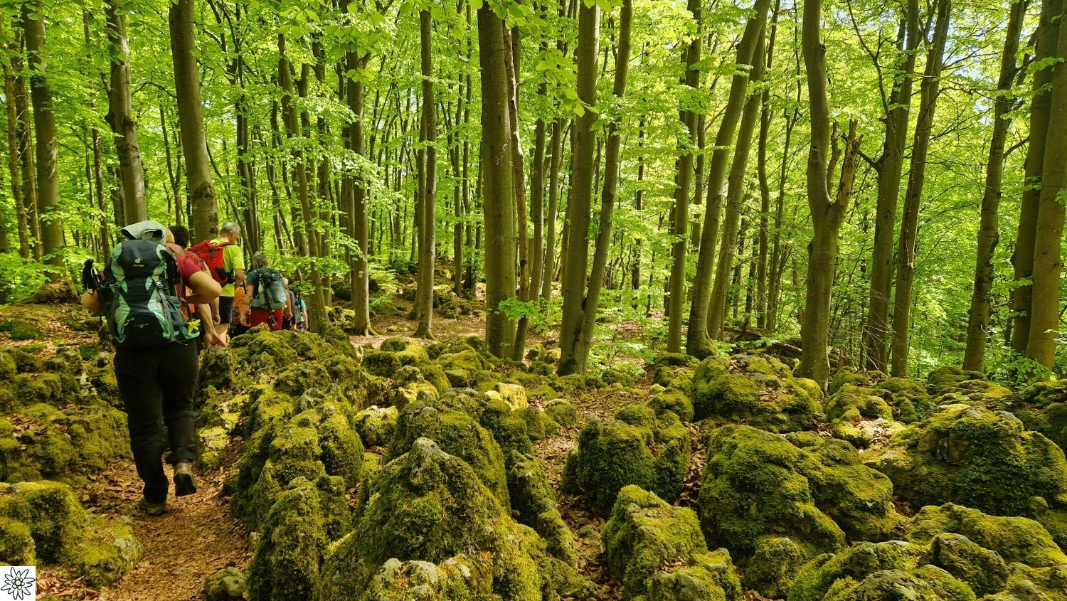 Von hier starte man mit den Fahrzeugen zum zweiten Ziel dieses Tages, den Eibgrat, zum Wanderparkplatz nach Spies. Auf diesem über 1 km langen anspruchsvollen Felsensteig war absolute Trittsicherheit und Schwindelfreiheit erforderlich. Zunächst führte der Weg am Waldrand entlang bis zu einem Felsdurchlass, der den Beginn des malerischen Steigs markierte. Der Weg führte durch enge Spalten und über Felsbrücken überraschend an den Fuß der Felsen. Danach erklimmt eine steile Leiter wieder einen Aussichtspunkt, mit 595 m der höchste Punkt des Grats und den Hohen Kamm. Immer wieder auf und ab durch eine abwechslungsreiche Felslandschaft erreichte man durch einen schmalen Durchschlupf das Ende des Eibgrats. Dem quer verlaufenden Weg rechts folgend erreichte die Gruppe auf Wald- und zuletzt Wiesenwegen wieder den Wanderparkplatz in Spies. Von hier trat die Gruppe die Heimfahrt an und erreichte nach einer Kaffeepause in der Jura-Raststätte nach zwei herrlichen Wandertagen in der Fränkischen Schweiz gesund und wohlbehalten wieder Waldkirchen.
