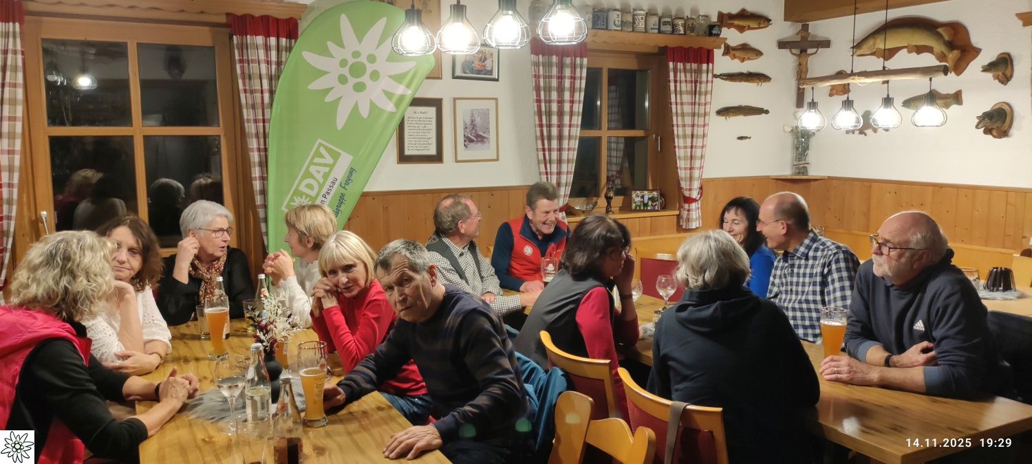 Bei netten Gesprächen in großer Runde und an den einzelnen Tischen ließ man die Erlebnisse bei den vergangenen Touren und auch bei der 55- Jahr- Feier bei herrlichem Sonnenschein auf dem Schneibsteinhaus mit den Touren der beiden Tage nochmals Revue passieren. So verging der Abend wie im Flug, bis dann gegen 23.00 Uhr die ersten Mitglieder aufbrechen mussten.