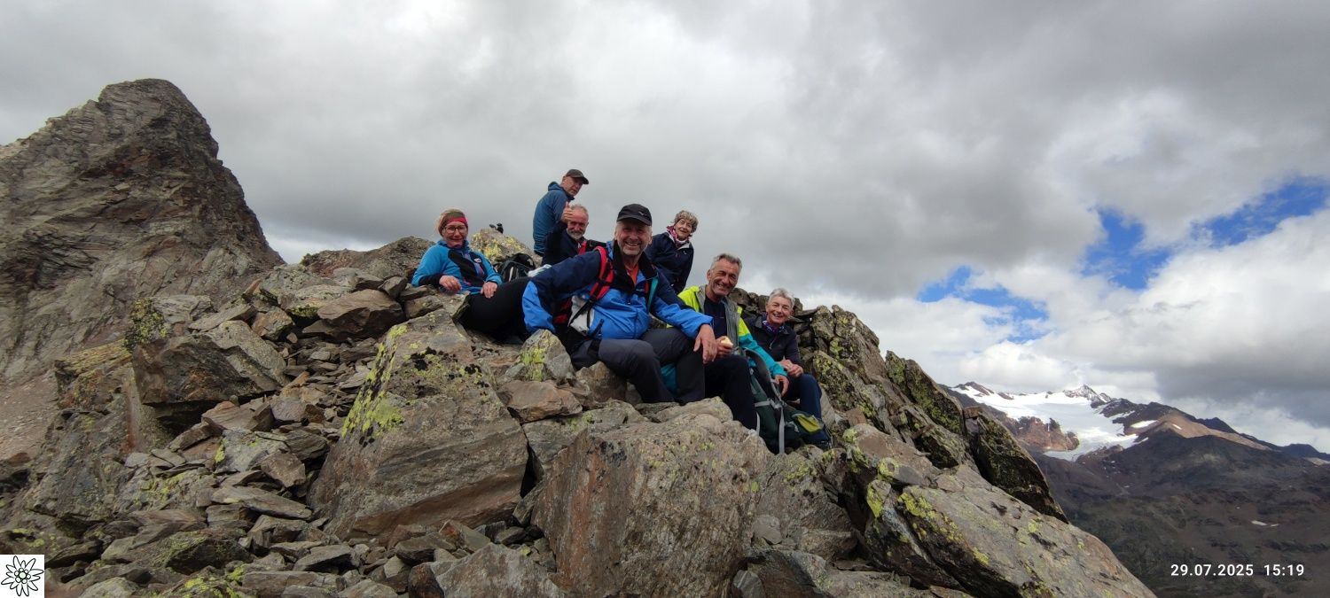 Der dritte Tag brachte den ersehnten strahlend blauen Himmel. Perfekt für die atemberaubende Wanderung auf den Dosso Tresero 2356 m, mit herrlichem Ausblick hinab auf Santa Caterina und zurück auf die gesamte Route der vergangenen Tage. Weiter ging es entlang von Wasserfällen und über zahlreiche Gletscherbäche, die allesamt den Torrente Gavia speisen. Langsam kam das Ziel, der Gaviapass 2652 m in Sicht, eingerahmt vom Corno dei Tre Signori 3360 m und dem Monte Gavia 3220 m. Direkt auf der Passhöhe lag die letzte Übernachtungsstation, das Rifugio Bonetta. Hoch frequentiert von unzähligen Motorrad-Bikern und Radfahrern, welche die berühmte Bergetappe der „giro d´italia“ fahren wollen. Nach kurzer Rast war noch genügend Zeit, den Monte Gavia 3220 m zu besteigen, um nochmal den herrlichen Rundumblick auf die Ortler Alpen zu genießen.