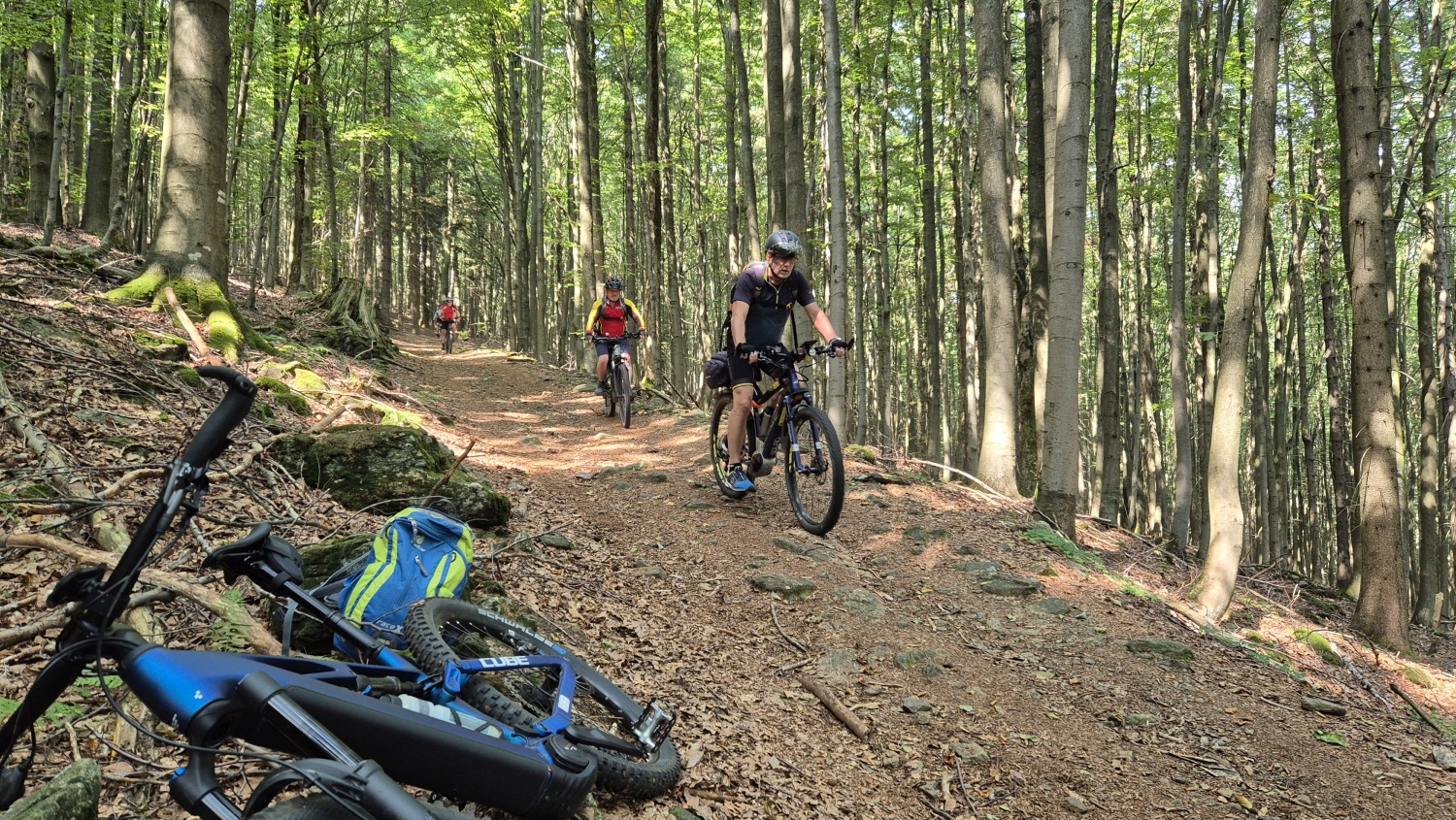 Nach den obligatorischen Fotos und der Besichtigung des Areales und des Turmes wurde natürlich noch in dem empfehlenswerten Lokal eingekehrt, das kleine Museum mit Orden, Uniformen und Bilder von Stalin und Tito besichtigt, bevor dann die Abfahrt zurück zum Ausgangspunkt begann. Ab dem Gipfelplateau ging es gleich mal steil bergab, hinein in einen Waldsteig, der aber von allen in flottem Tempo über Steine und Wurzeln, vorbei am Maly Cerchov, gut gemeistert wurde. Über die gesamte Abfahrtsstrecke wechselten sich Waldsteige und Forststraßen ab, bis dann kurz vor der Grenze, auf ca. 500 m Seehöhe das „Iron Curtain Memorial“ (Eiserner Vorhang Denkmal) erreicht war.