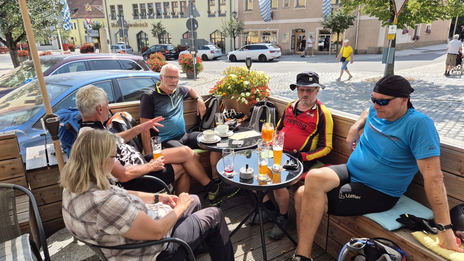 Bei der Durchfahrt durch den Stadtplatz mit den Kulissen des Drachenstiches wurde beschlossen, den Drachensee zu umrunden und schließlich noch die Drachenhöhle mit dem Drachen zu bewundern. Der Tourtag endete (nach etwa 1000 Höhenmetern) mit einer gemütlichen Einkehr auf der Terrasse eines Cafes unterhalb des Stadtplatzes, bevor dann alle den Heimweg antraten.