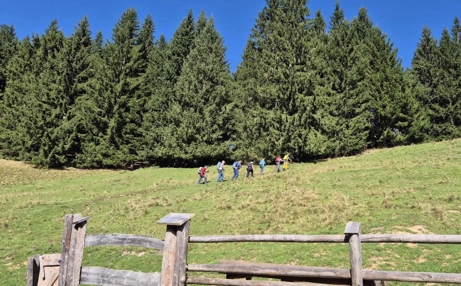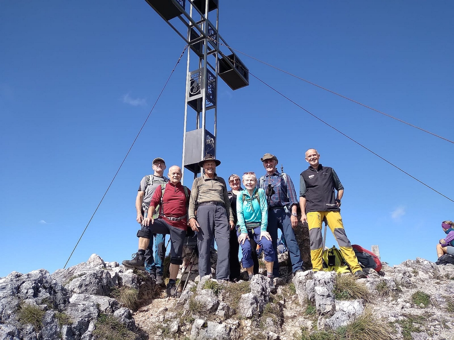 Die Touren gingen auf weniger bekannte Gipfel des Toten Gebirges. Am ersten Tag führte der Tourenleiter seine Begleiter per Seilbahn auf den 986 m hohen Grünberg und dann per pedes vorbei am Baumwipfelpfad mit seinem Aussichtsturm zu dem fast 100 m tiefer liegenden Laudachsee. Von dort führte der Weg hinein in einen teils versicherten Felsensteig, steil bergauf bis zur Hohen Scharte auf 1105 m. Ab hier ging es nun weiter aufwärts, immer entlang der Felsen- Abbruchkante, bis das Katzensteinfenster erreicht war. Nun führte der Felsensteig kurz abwärts, vorbei an der Gamsluckn und dann hinauf auf den Katzenstein mit 1349 m Höhe. Dort bot sich in herrlicher Ausblick zurück zum Laudachsee, auf den Traunsee und auf den benachbarten Traunstein, aber auch auf das Tagesziel des nächsten Tages. Der Rückweg entsprach dem Aufstiegsweg und wurde nur unterbrochen von einer Einkehr in der Ramsaualm knapp über dem Laudachsee. Nach der Rückkehr an der Talstation ging die Fahrt etwa 10 Km zum gebuchten Quartier „URZN“ in Altmünster, hoch über dem Traunsee. Mit schmackhaftem Essen und netten Gesprächen war der Abend schnell vorbei und alle freuten sich schon auf Tag zwei.
