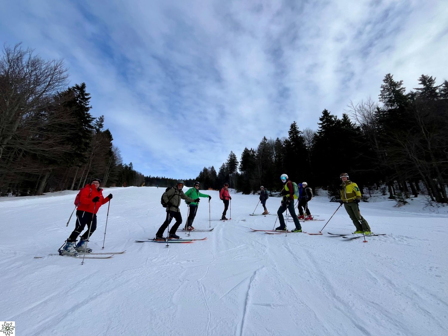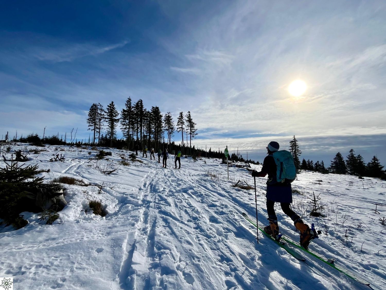 Treffpunkt für 11 Skitouren-Begeisterte war der Zentralparkplatz am Skigebiet Hochficht. Bei guter Schneelage führte die Tour gleich in den Wald am Rehberg, Richtung Norden zum Fußgänger-Grenzübergang Holzschlag. Beim Zollhäusl stieg die Gruppe in den sogenannten „Ge(h)nussweg“ am Grenzkamm ein. Bei mäßiger Steigung war der Brunnauberg (Studnicna) 1165 m schnell erreicht. Der steile Nordanstieg auf den Reischlberg 1282 m war die schwierigste Passage der Tour, wurde aber von allen sehr gut gemeistert. Weiter ging es in leichtem Auf und Ab, bei herrlicher Rundsicht nach Böhmen und in den Bayerischen Wald.