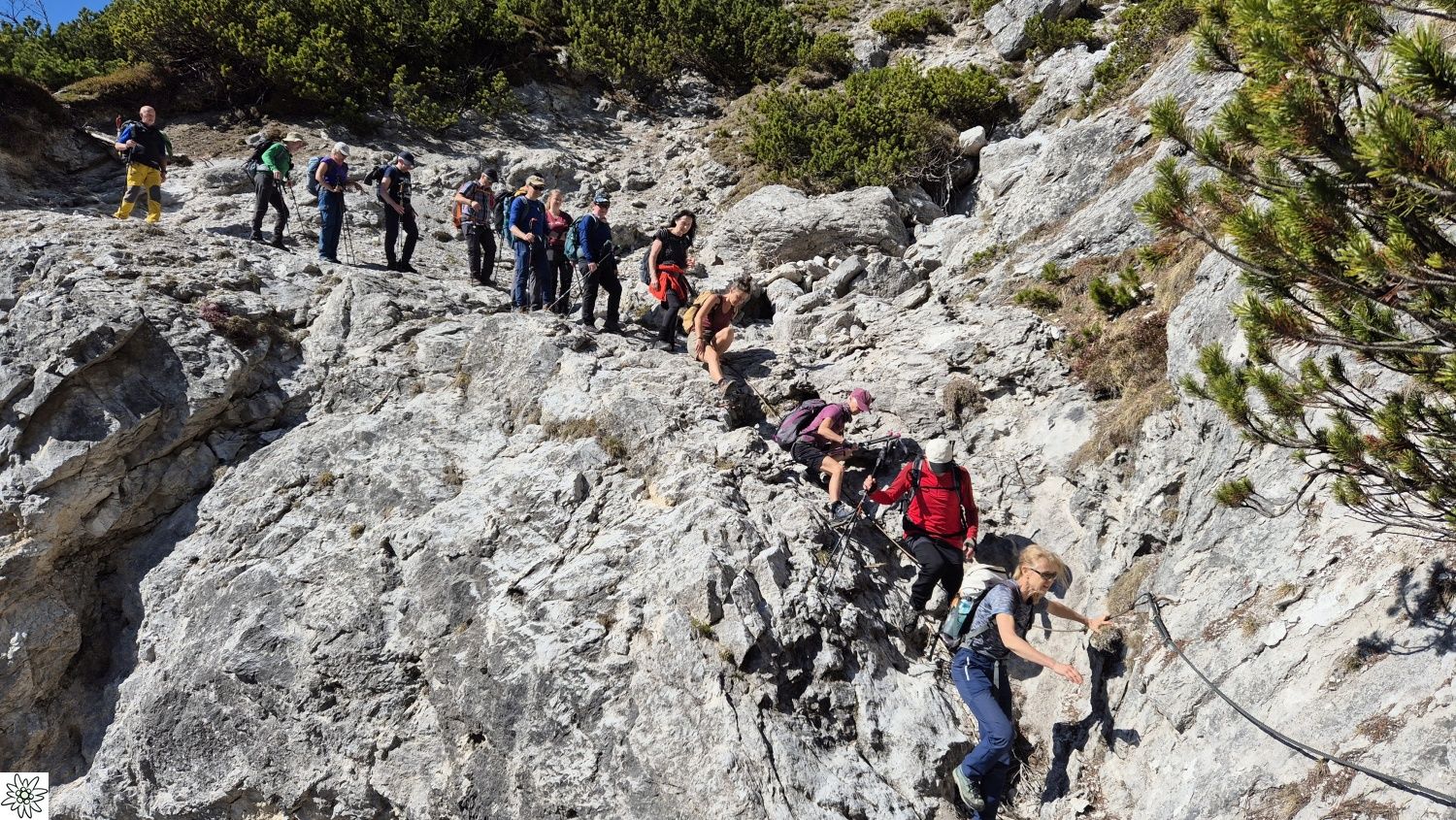 Die Bereiche des Felsensteiges waren sehr gut mit Drahtseilen abgesichert, zum Öfenbach hinunter mussten dann ein paar Leitern überwunden werden, die aber für keinen ein Problem darstellte, denn die teilnehmenden Fachübungsleiter waren in der Gruppe aufgeteilt. Weiter gings dann wieder in den gesicherten Felsensteigen, bis dann nochmal eine Herausforderung am Kuhloch anstand. Im letzten Winter war ein Teil des Steiges abgerutscht, deshalb hat der Wegewart ein Kletterseil eingehängt, um die Höhendifferenz gesichert überwinden zu können. So wurde dann nach Prüfung der Befestigung und der Stabilität, diese Stelle nach detaillierter Anweisung durch den Tourenführer, einzeln problemlos überwunden. Nun war es nicht mehr weit, bis dann wieder das Latschengelände und später der Waldsteig erreicht war. In einem zugewachsenem Bachtal ging es hinunter zur Steinalm auf ca. 1300 m Höhe, wo eine kurze Trinkpause bzw. Rast eingelegt wurde.