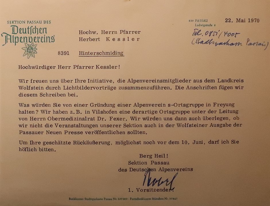Die Idee war geboren und am 10. Juni 1970 fand im Gasthof zur Post in Freyung die Gründungsversammlung von Bergbegeisterten aus dem ehemaligen Landkreis Wolfstein statt. Es waren 42 Mitglieder anwesend (16 aus Freyung, 14 aus Waldkirchen und 12 aus den umliegenden Dörfern). Die Ortsgruppe Freyung wurde als Untergruppe der Sektion Passau gegründet und den Vorsitz übernahm Pfarrer Herbert Kessler aus Hinterschmiding.